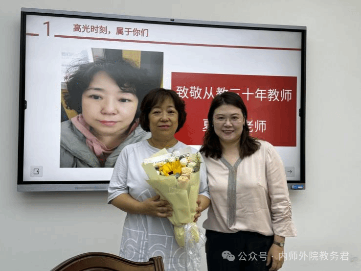 随后,全体教师向从教三十年的夏美玲老师表达了敬意,感谢夏老师从教三十余载,倾心从教、精研教学,无私奉献,默默耕耘。