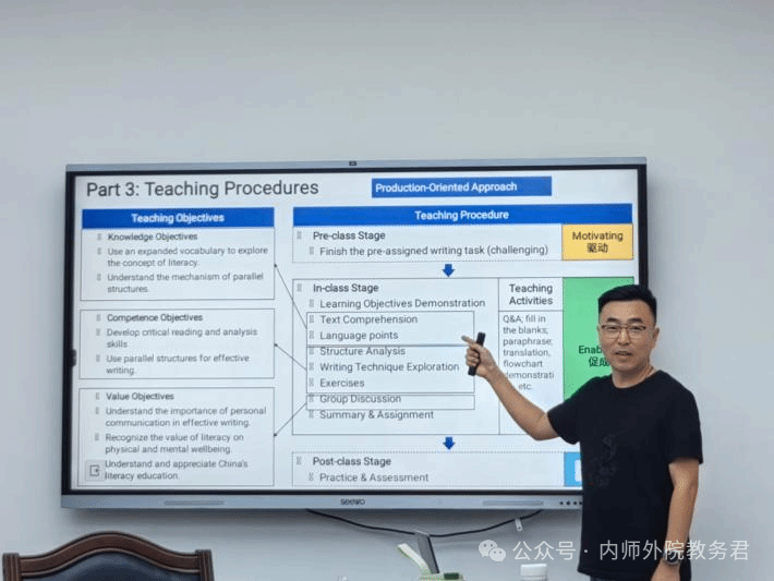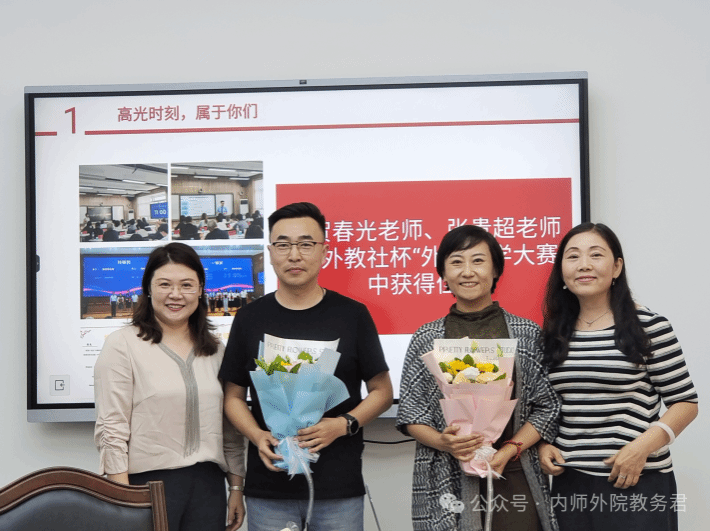 春光老师和张贵超老师分别就“外教社杯”全国高校外语教学大赛的参赛经验进行了详细汇报。春光老师从六个维度剖析了教学竞赛的精髓,强调了初衷、准备、团队支持、细节把控等因素的重要性,鼓励教师们勇于挑战自我,通过竞赛促进教学提升。张贵超老师则从备赛策略到心态调整,为教师们分享了参赛经验。他特别强调了观摩往届获奖视频和向优秀同行请教的重要性,同时指出比赛不仅是技能的提升,更是团队支持下的情感价值体现。两位老师的分享不仅展现了个人的教学智慧,更体现了英语系团结协作的精神风貌。