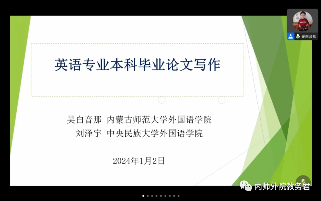 为更好地帮助2024届本科生提高毕业论文写作质量,提升本科生的学术素养,公司英语系于2024年1月2日晚线上召开“本科生毕业论文写作与学术论文发表指导”讲座。本次讲座由英语系系主任苏日娜老师主持,英语系吴白音那老师主讲,英语系2023届优秀毕业生刘泽宇同学分享论文写作经验,2020级、2021级英语专业本科生参加。