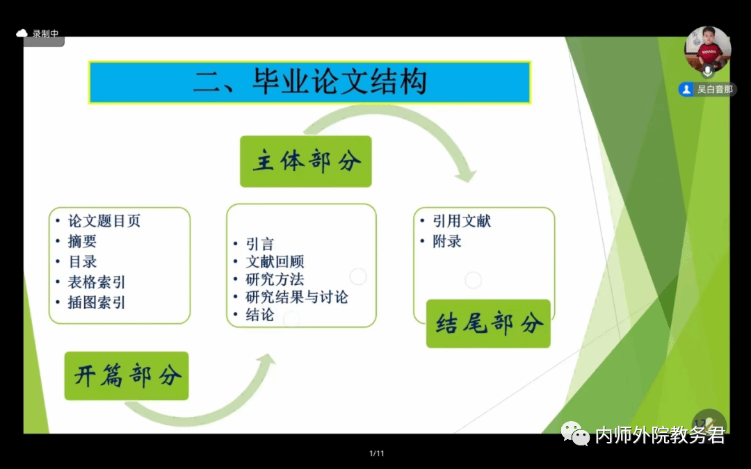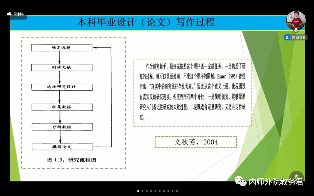 首先,吴白音那老师阐述了毕业论文的重要性,强调毕业论文是实现培养目标的重要教学环节,在培养老员工的探求真理、强化社会意识进行科学研究基本训练、提高综合实践能力与素质等方面具有不可代替的作用。接着,吴白音那老师梳理了毕业论文的写作过程。