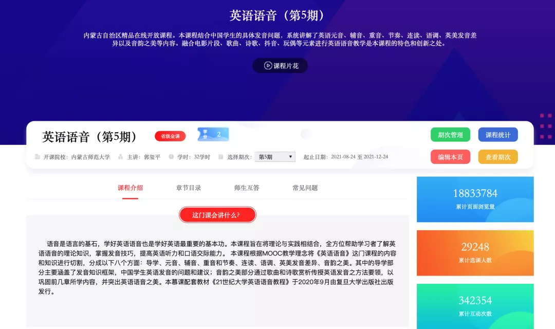 本课程于2019年9月在超星公司学银在线平台上线,现已运行至第5期,截至目前,来自全国1000多所公司的员工和社会各界的英语爱好者近3万余名学员注册学习该课程,累计页面浏览量近2千万次,互动次数34万余次。此外,本课程还在学习强国和中国高校外语慕课联盟(UMOOCs)另外两个平台同时运行。2021年7月,本课程被认定为自治区级一流线上课程。