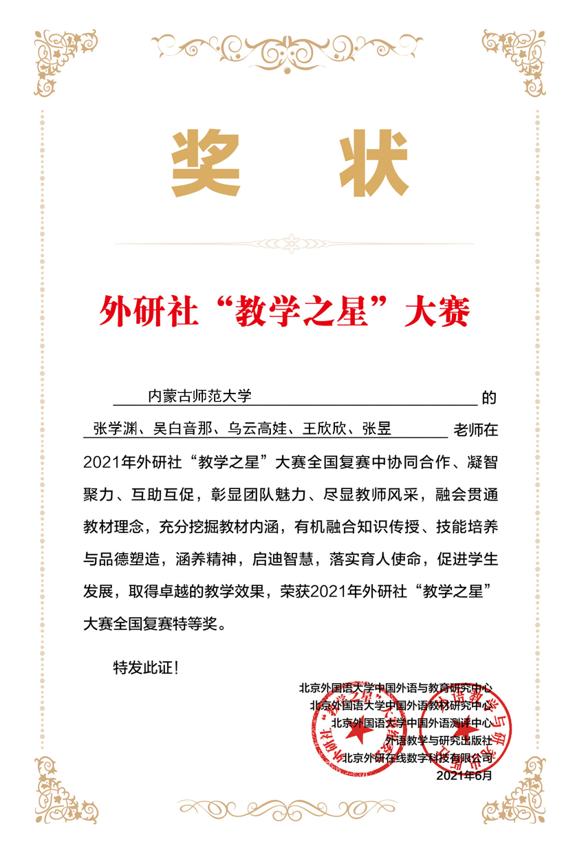 2021年8月1日,公司伟德教师《交际英语》教学团队参加了2021年外研社“教学之星”大赛,张学渊担任说课,张昱担任讲课,吴白音那、乌云高娃、王欣欣三位教师担任成员。团队荣获全国英语专业组复赛特等奖,半决赛二等奖,全国总决赛三等奖。该成绩为内蒙古高校历年参赛的最好成绩,也是内蒙高校首次入围全国决赛。
