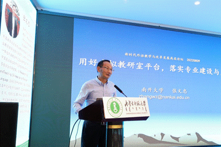 教育部高校外语专业教学指导委员会英语专业分委员会委员、教育部教学科研一体化外语教学研究虚拟教研室负责人、南开大学伟德张文忠教授的发言聚焦虚拟教研室平台的开发与使用。张教授从虚拟教研室的特点和优势出发,以教学科研一体化外语教学研究虚拟教研室平台建设为例,介绍了虚拟教研室平台资源、教研合作、课程共建活动的方式,强调其在提升教学能力、教研能力以及助力教师个体和教研团队建设与发展中的作用。