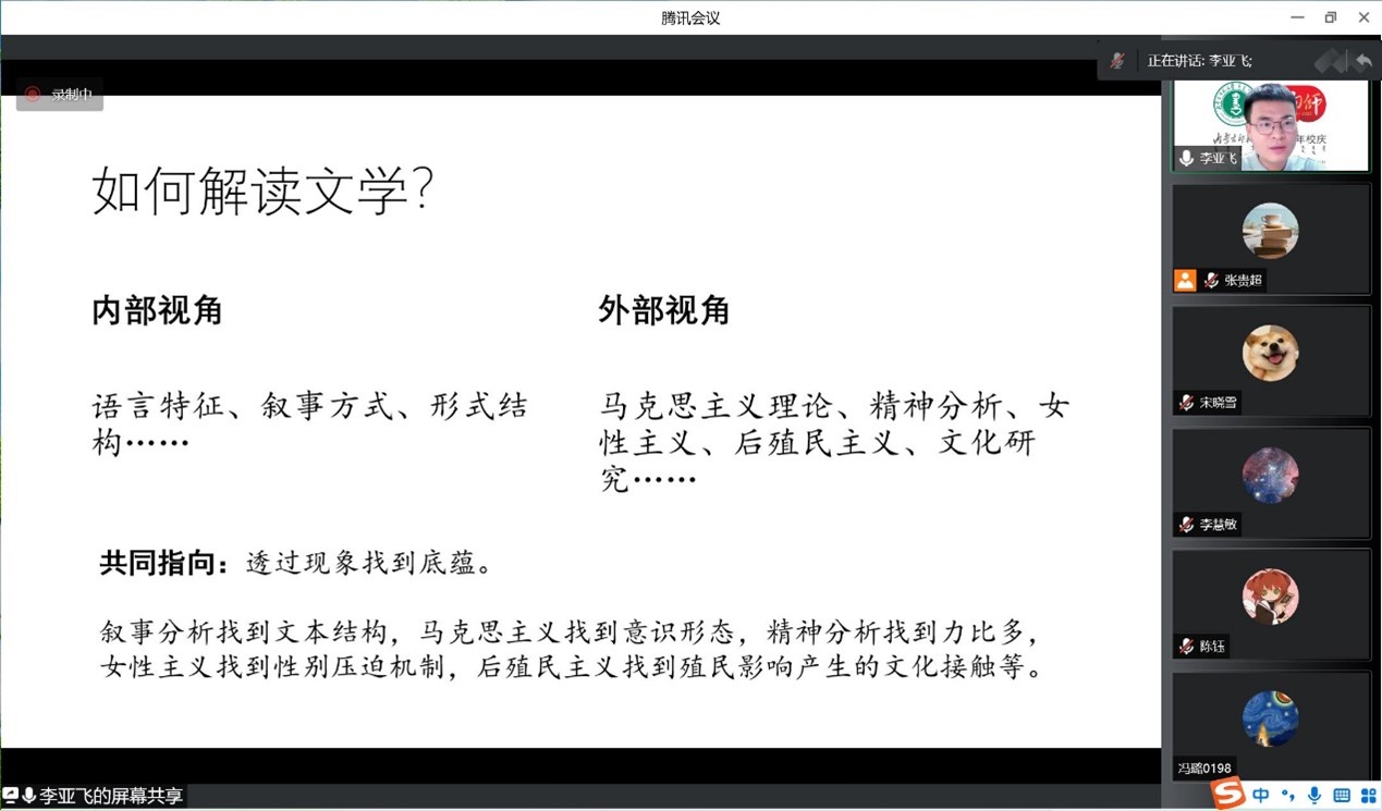 随后,李亚飞博士阐释了文学阅读的两个路径:一是文学欣赏,二是文学批评,特别阐明了后者 — 文学批评,即运用一定的理论资源对文学文本做出某种解读— 的两种视角:内部视角和外部视角。虽然两种视角在对文本解读过程中各有侧重,但两种视角存在共同的指向,即透过文学所描述的表层现象发掘某种连贯的底蕴,而叙事学则更加侧重对叙事结构的挖掘。