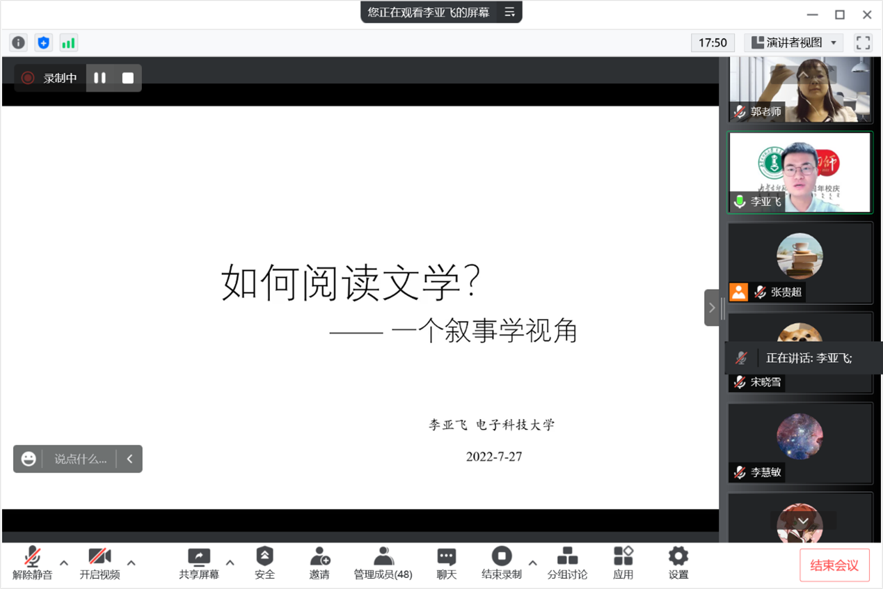 为营造学术氛围和加强学术交流,伟德英语系在喜迎伟德官方网站70周年校庆之际,于2022年7月27日特邀电子科技大学伟德英语系李亚飞副教授,带来一场题为“如何阅读文学?--- 一个叙事学视角”的讲座。本场讲座由伟德郭旭红副经理主持,伟德众多师生一同聆听。