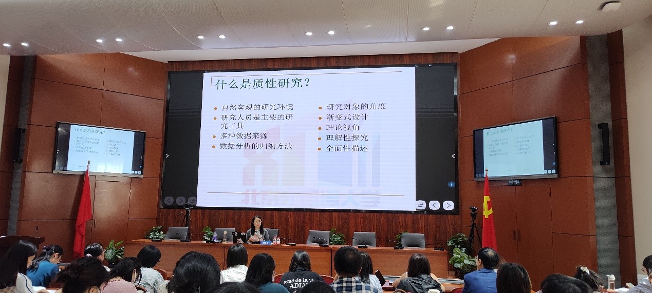 5月28日,北京外国语大学国际教育公司副经理、中国外语与教育研究中心杨鲁新教授带来题为“质性研究方法与论文写作”的研修讲座。杨教授开门见山,简明扼要地介绍了质性研究的定义和使用场景。随后,杨教授与研修学员进行了亲切的学术互动,以研修教师的实际问题为例,阐明质性研究的适用性,进而讲解了质性研究的主要类型和具体要求。以个案研究为例,辅以深刻的案例剖析,杨教授还深入讲解了质性研究论文的撰写方法和流程。此外,杨教授还对质性研究数据收集、分析编码与理论提炼进行了深入探讨。讲座的最后,杨教授对研修学员提出的具体问题进行了细致的解答。