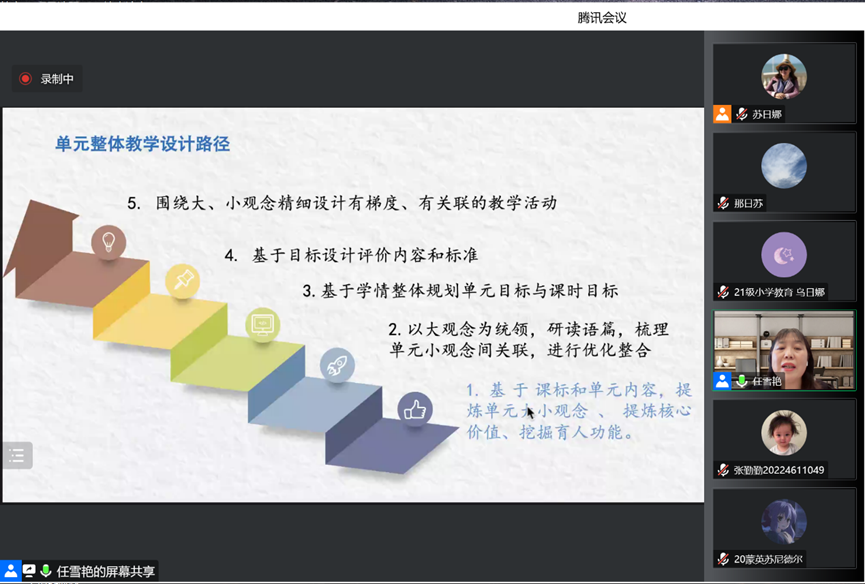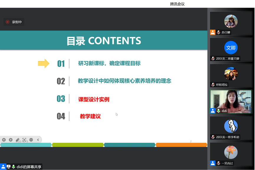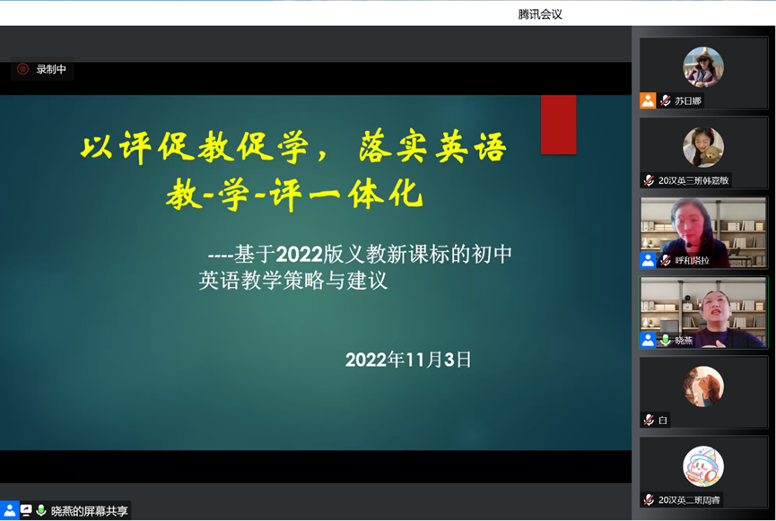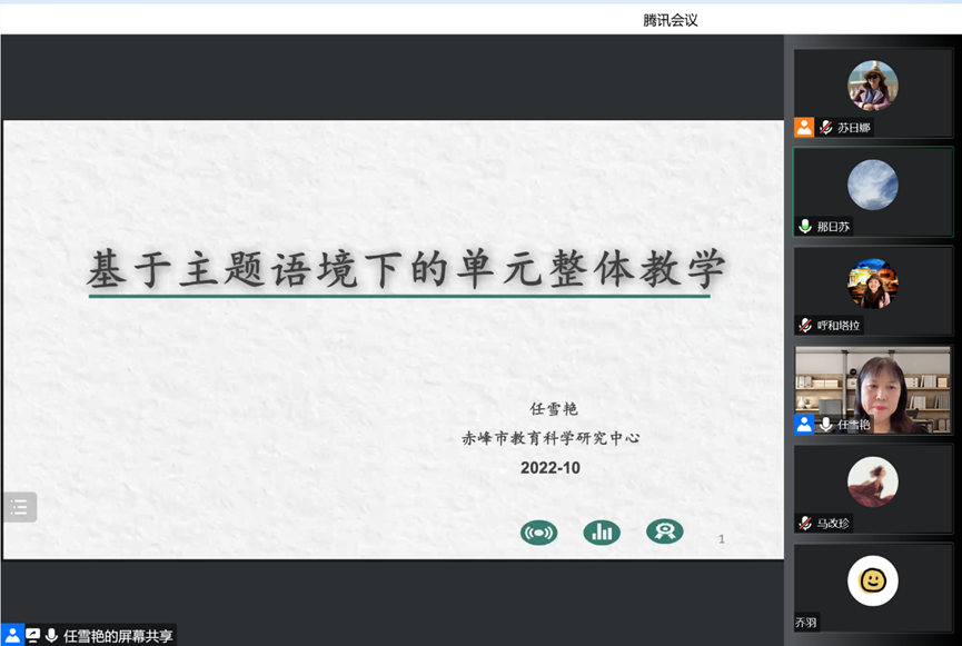2022年10月20日下午,赤峰市公司产品研究中心英语教研员任雪艳老师做了题为《基于主题语境下的单元整体教学》的线上讲座,副经理那日苏主持讲座,英语系教师教育团队全体教师,2019级、2020级全体本科生以及部分研究生参加。