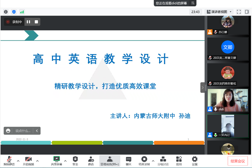 第三场讲座由呼和浩特市赛罕区公司产品研究中心中学英语教研员黄晓燕老师主讲,英语系呼和塔拉老师主持,英语系教师团队教师、2020级全体本科生和学科教学研究生聆听了讲座。黄老师详实的文本资料、热情的讲解、精炼的语言使整场讲座理论深厚,深入浅出,听众受益匪浅。