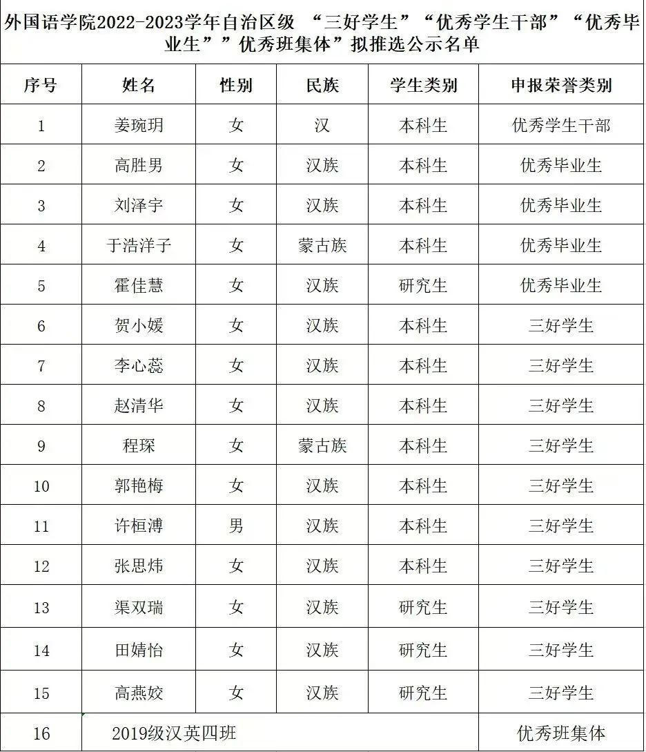 根据公司《关于开展公司2022-2023学年度自治区级”三好员工”、“优秀员工干部”、“优秀毕业生"和”优秀班集体”》(校学发[2023]9号)文件要求,公司评审委员会于2023年5月5日召开了评选工作专题会议。经员工本人、班集体申请,学工组审核,拟评选出伟德 2022-2023学年自治区级”三好员工”、优秀员工干部”、“优秀毕业生”、“优秀班集体”,为体现公开、公平、公正的原则,现将拟推荐名单予以公示。如有异议,请来电或来信反映。 公示时间:5月5日﹣5月7日 受理电话:0471-7381039 邮箱:691503251@qq.com