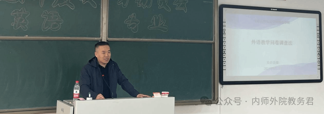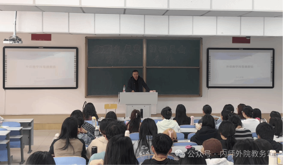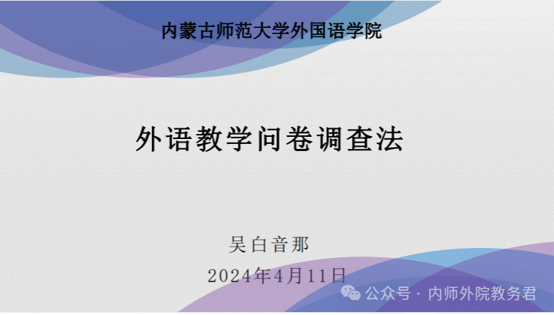 本次讲座题目为“外语教学问卷调查法”。在本场讲座中,白音那教授从研究的定义开始,为同学们详细讲解了问卷调查法的内涵、格式与设计、问卷信效度测试、问卷实施和回收、数据统计与检验、研究案例分析六大基本内容。白音那教授结合众多丰富案例帮助同学们以更为直观的角度了解外语教学问卷调查法的实施步骤,化抽象于具体,在讲座的进行过程中复现了问卷调查法的研究思路与研究内容。此外,白音那教授为同学们推荐了三本参考书,方便同学们在具体的研究过程中进行查阅。最后,针对同学们提出的各种疑惑和问题,白音那教授进行了耐心细致地解答和交流。